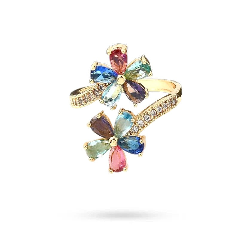 Bague femme réglable double fleur avec zirconiums couleurs sertis