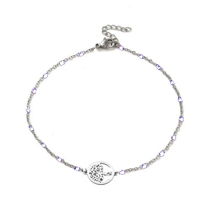 Chaîne de cheville acier inoxydable maille forçat blanche arbre de vie