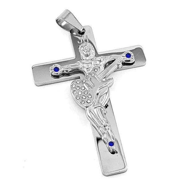 Croix guitare JOHNNY HALLYDAY en acier 316 - Couleur argenté - 5.5 cm pierre bleu avec cordon cuir