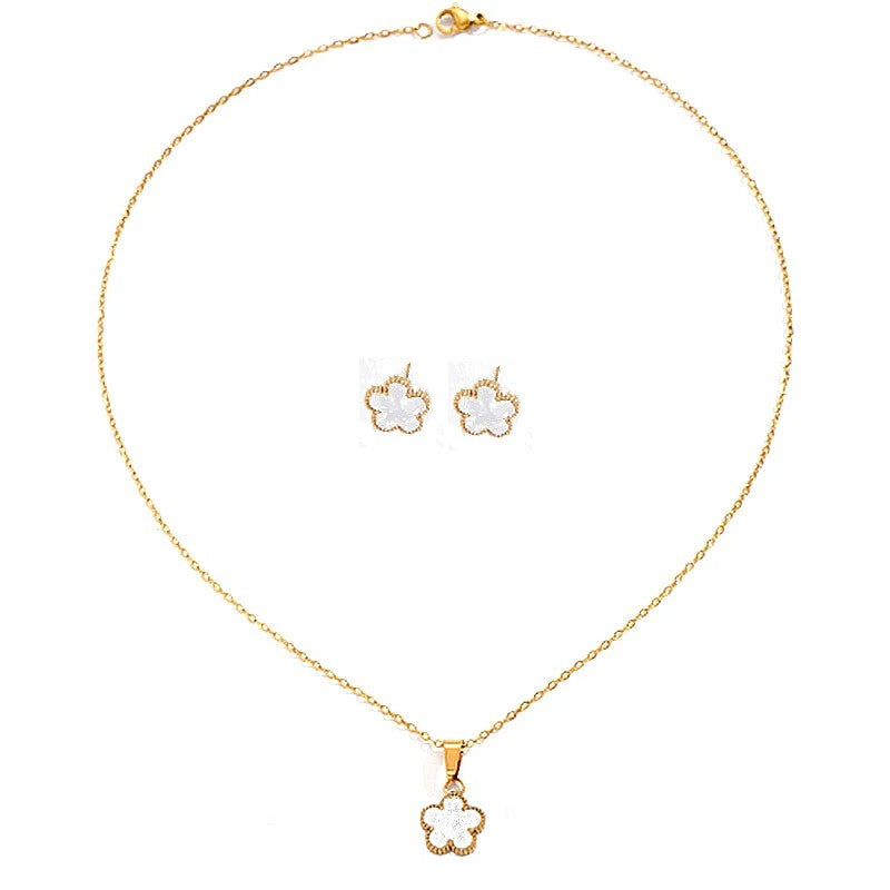 Parure collier pendentif chaîne fleur nacre plaqué or 18k