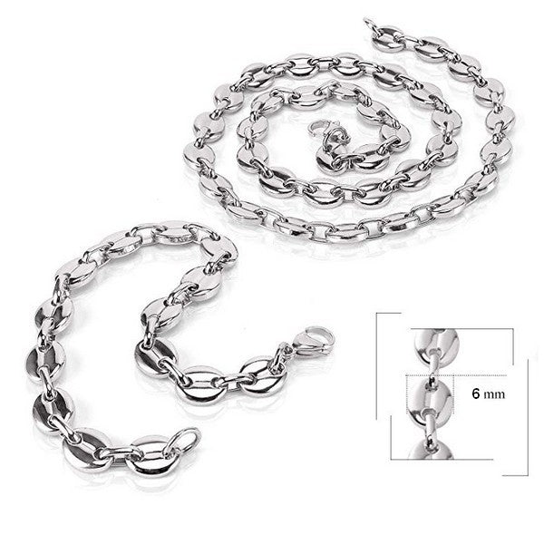Bijoux pour Homme - Magnifique parure en Acier 316, composée d'un collier maille grain de café de couleur argenté et d'un bracelet assorti.