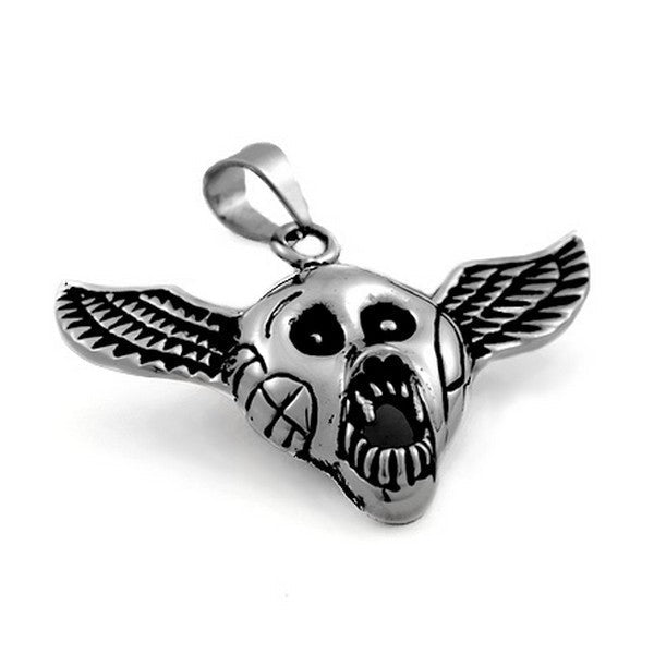Pendentif acier 316 argenté Gothique Rock ou Biker - Ailes + Tête de mort
