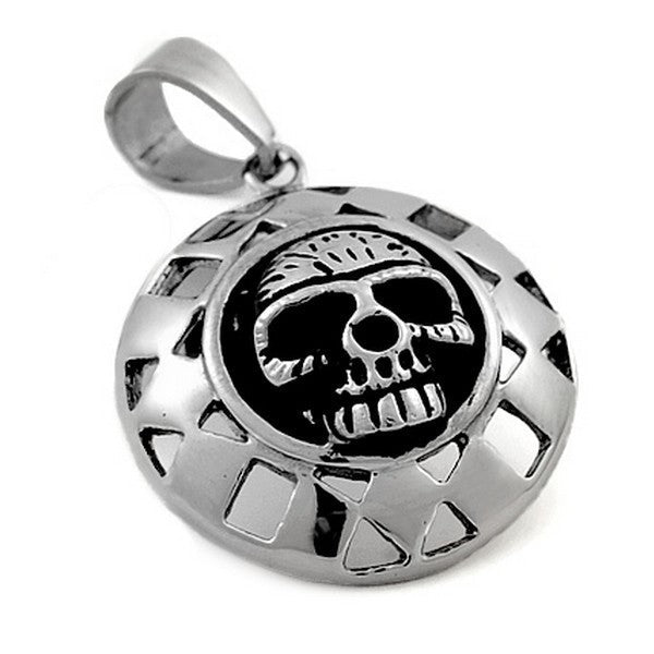 Pendentif acier 316 argenté Gothique Rock ou Biker - Cercle ajourés d'une tête de mort
