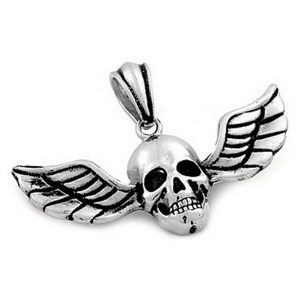 Pendentif acier 316 argenté Gothique Rock ou Biker - Tête de mort + Ailes