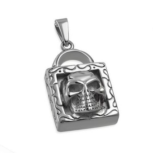 Pendentif acier 316 argenté Gothique Rock ou Biker - Tête de mort cadenas