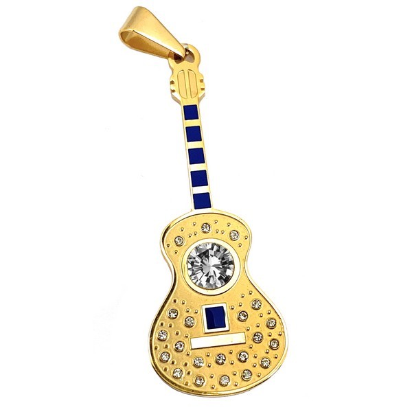 Pendentif acier 316 doré Gothique Rock ou Biker - Guitare bleu agrémenté d'un diamant cz